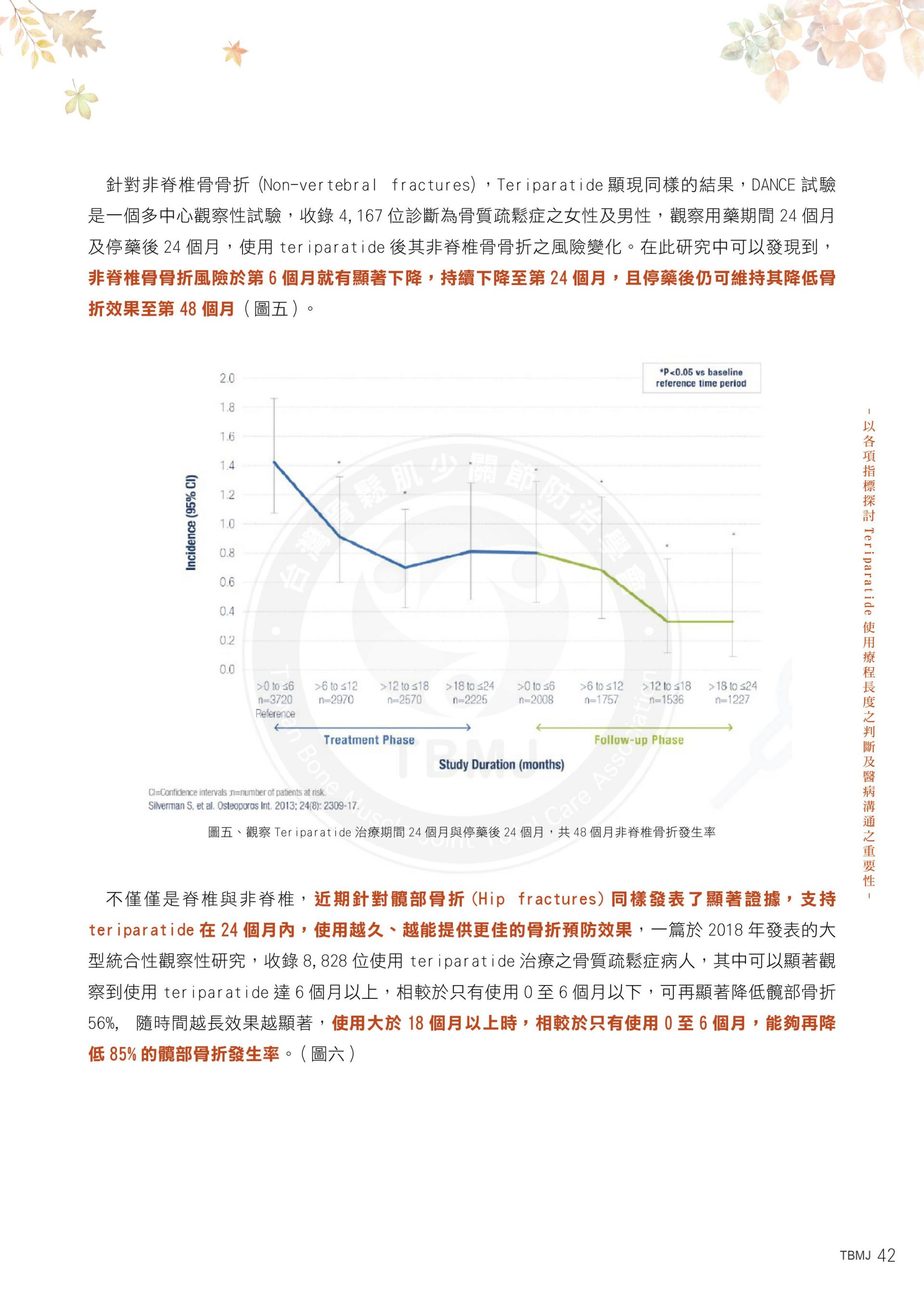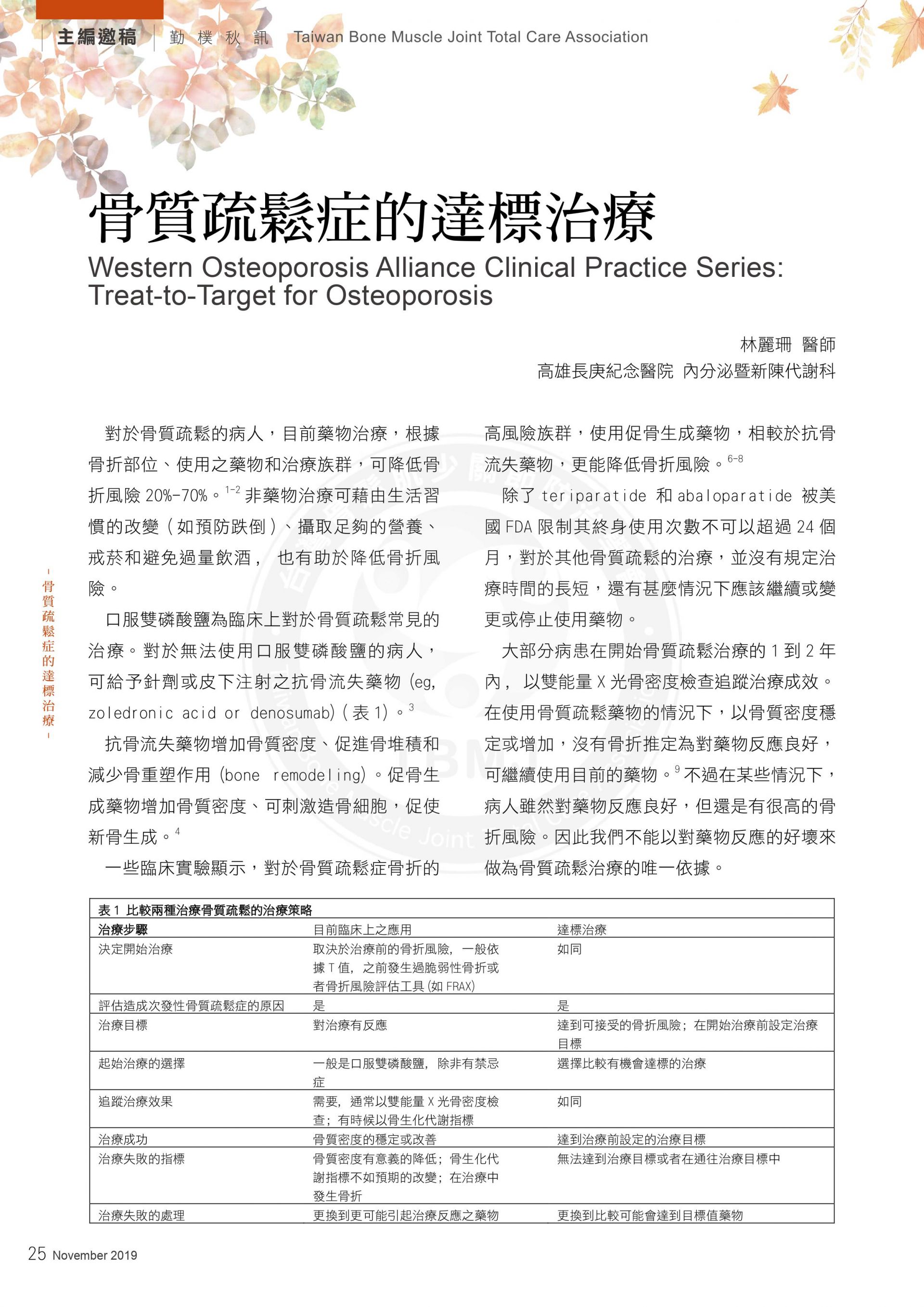 台灣骨鬆肌少關節防治學TBMJ會以健康促進預防為優先,宣導民眾建立正確防治識能,加強預防跌倒的措施,減少骨折發生。 台灣骨鬆肌少關節防治學會TBMJ協助臨床醫師為每位患者選擇最有效的初始治療方案,並在適當時間改變治療方案。