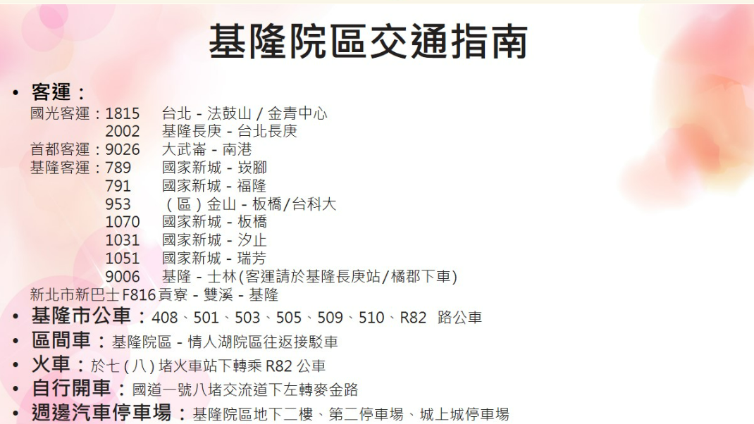 基隆長庚─台北長庚2002路線 基隆客運: 基隆─汐止 1031路線、基隆─板橋 1070 路線 基隆─士 林 9006路線、基隆長庚─台北科技大學953 台鐵接駁公車: 七堵火車站R82路線,八堵火車站510路線 首都/大都會客運: 捷運南港展覽館站─大武崙 9026路線