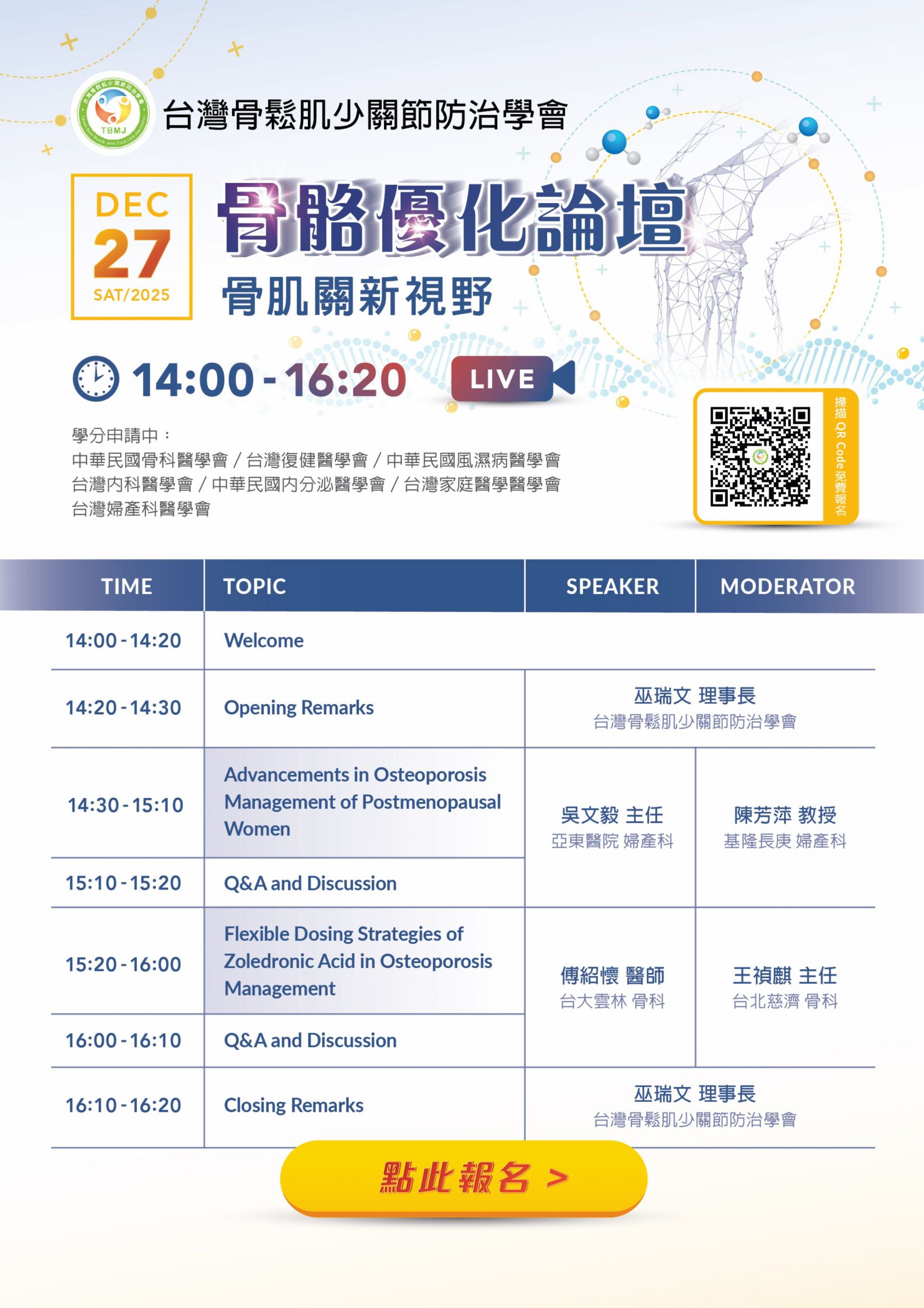 *報名費:免費 *報名連結:https://bit.ly/TBMJ20251227R *學分申請:骨科醫學會/內科醫學會/風濕病醫學會/內分泌醫學會/復健醫學會/家庭醫學會/婦產科